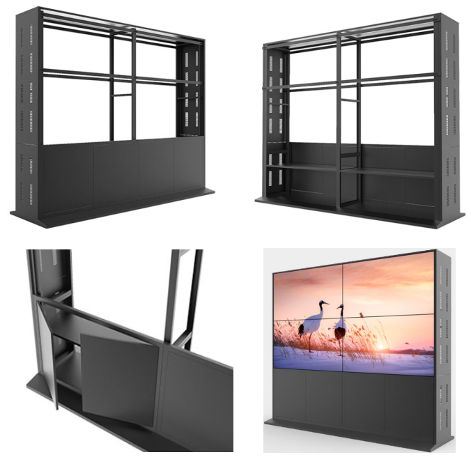 全封闭一体化机柜式,前后左右上下四周封板包围,全方位可调节,底部开门,能满足全系列拼接单元支撑安装固定;采用优质冷轧钢板工业级钣金材质,外加静电保护,主体结构安装简易方便,柜体设计活动门板检修维护便捷,多方位功能布线方便跳线管理布线,每位下柜体配置一块层板可进行高度和深度调整,便于设备放置安装,可根据现场环境色调按照色卡来定制黑色/白色/灰色/蓝色等颜色,既解决屏面安装的同时且与现场环境装饰搭配,柜体表面处理经过脱脂/酸洗/磷化/静电喷塑高温烤漆等工艺确保表面细腻美观,两侧通风口设计轻松散热。